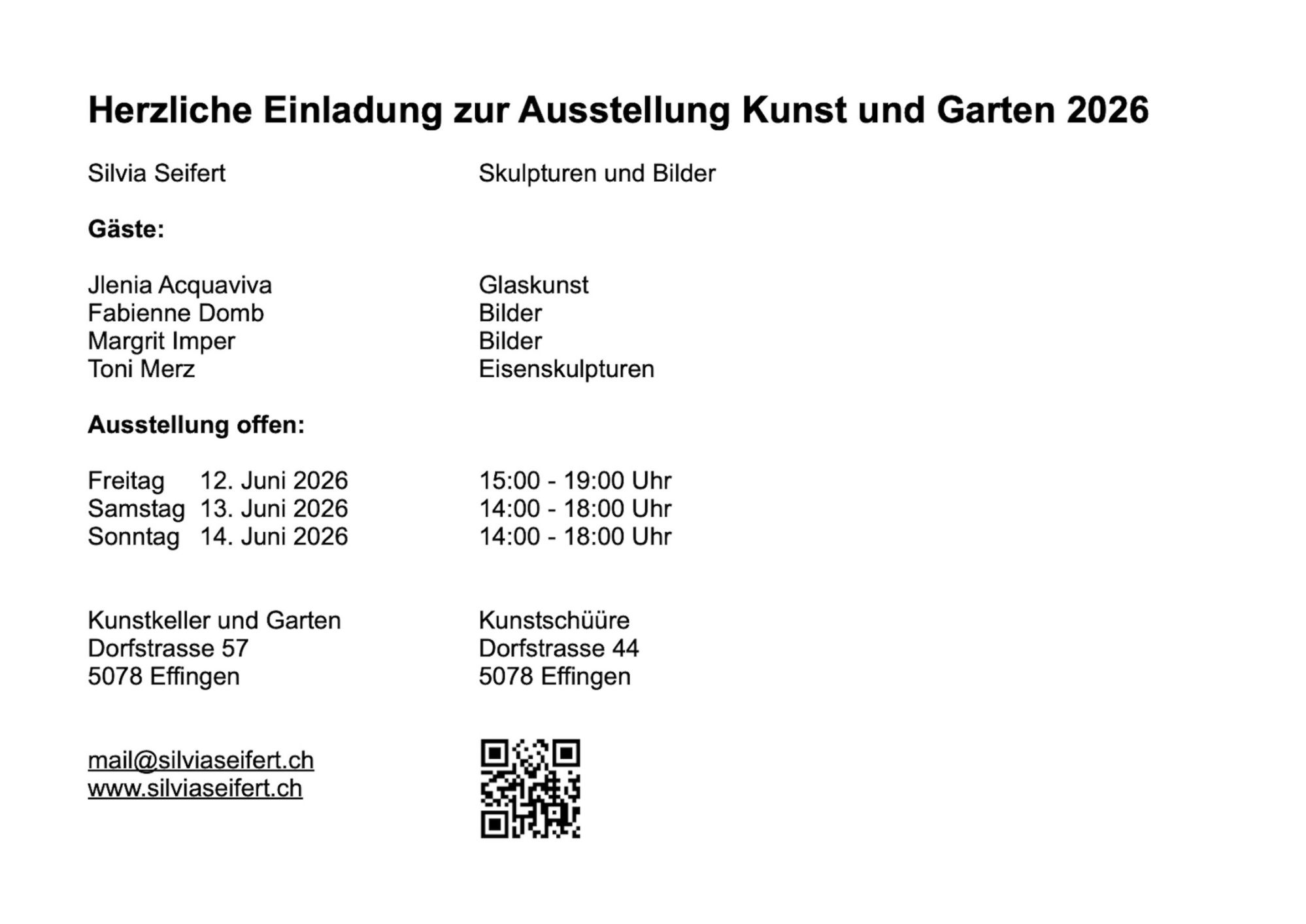 Die diesjährige Kunst- und Gartenausstellung bietet einen exklusiven Einblick in Seiferts neuesten Werke, die in ihrer Vielfalt und Ausdruckskraft begeistern. Mit großem Feingefühl für Form, Farbe und Material erzählt die Künstlerin ihre Geschichten – inspiriert von der Natur und der Schönheit des Gartens, aber auch von tiefgründigen, persönlichen Motivwelten. Ob in malerischen Darstellungen oder in beeindruckenden Skulpturen – jedes Werk entfaltet seine eigene, emotionale Kraft.